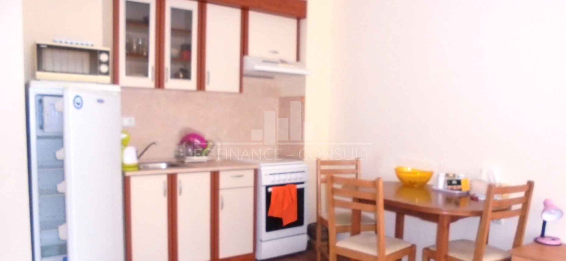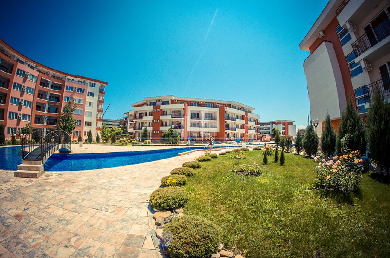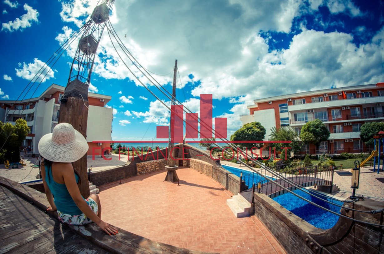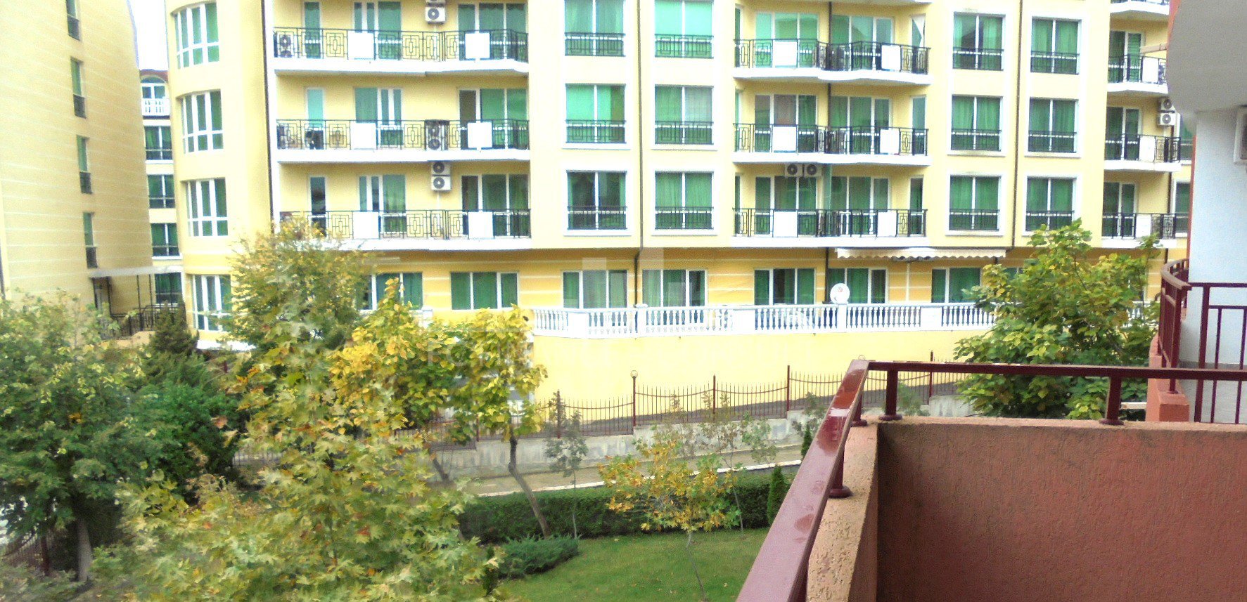 Тип на имота: студио • Разпределение: коридор, дневна с кухненски кът, баня с тоалетна, балкон • Квадратура: 48 кв.м с вкл.общи части • Локация и удобства: комплексът е разположен на брега на морето, в центъра на курорта • Разстояние до плажа: 10 метра • Възможност за разсрочено плащане до 7години: да • Първоначална вноска: 30% • Гледка: градина • Възможност за паркиране: в комплекса, на улицата • Разрешение за ползване: да • Годишна такса поддръжка: 14,50 евро/м2/година • Комплексът предлага следните удобства: рецепция, басейни, включително детски басейн, ресторанти с българска / европейска кухня, магазин за хранителни стоки и магазин за плажни аксесоари, фитнес уреди на открито или закрито, сауна, СПА център, детски клуб, стая за масаж, медицински център / медицинско обслужване в сезона, детски и спортни площадки, неохраняем и охраняем паркинг, обменно бюро, индивидуални екскурзии, коли под наем, тенис корт.