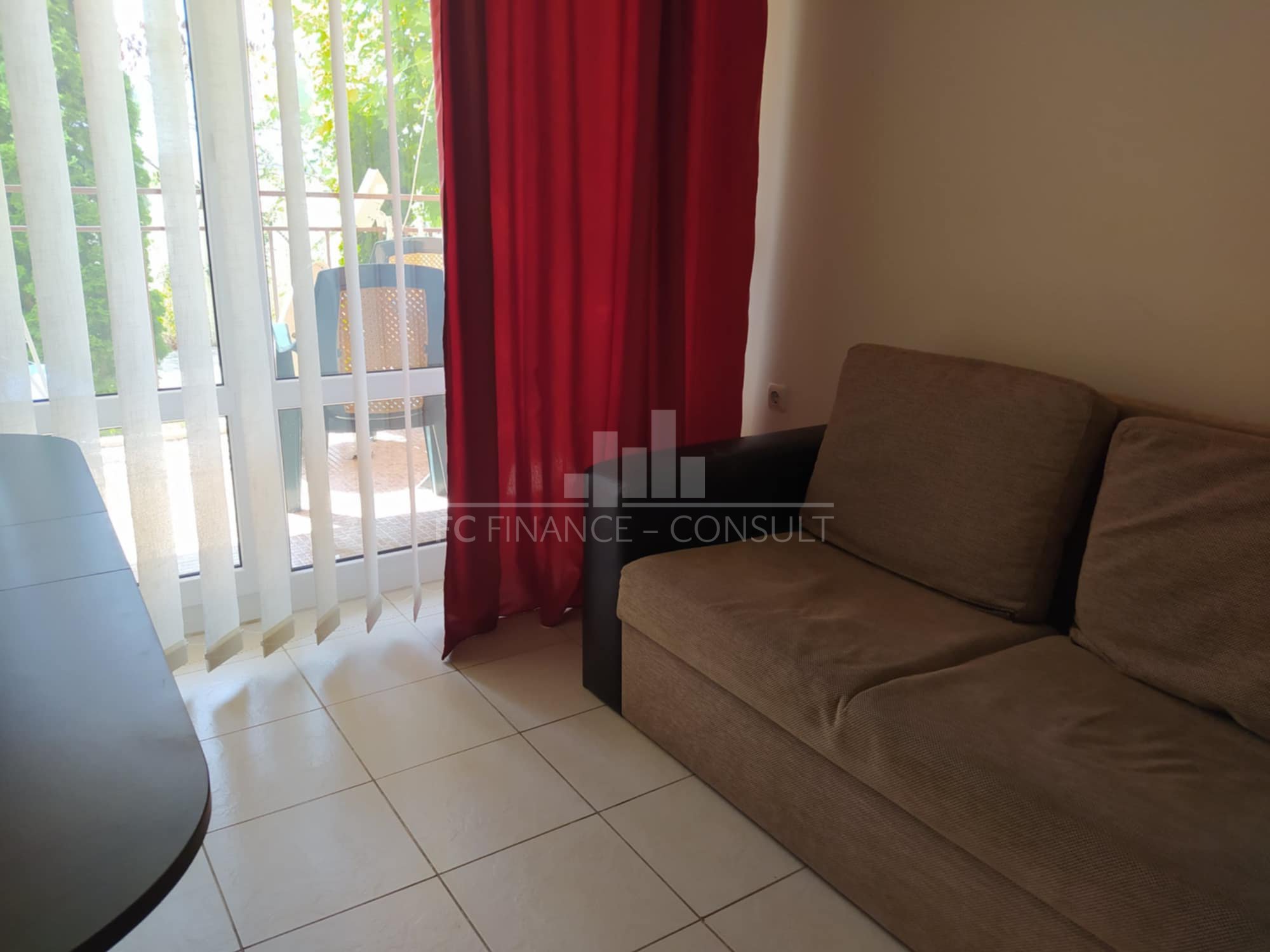 Малък, китен, спокоен и обзаведен двустаен апартамент в Слънчев бряг. • Тип на имота: 2 стаи • Разпределение: коридор, дневна с кухненски кът, спалня, баня с тоалетна, балкон • Квадратура: 47 кв.м вкл.общите части • Локация и удобства: комплексът е разположен в близост до центъра на курорта на тихо място • Разстояние до плажа: 600 метра • Възможност за разсрочено плащане до 7години: не • Първоначална вноска: 100% • Гледка: градина, поле • Възможност за паркиране: безплатно пред комплекса, на улицата • Разрешение за ползване: да • Годишна такса поддръжка: 13,50 евро/м2/година • Комплексът предлага следните удобства: рецепция, басейни, включително детски басейн, ресторанти с българска / европейска кухня, магазин за хранителни стоки и магазин за плажни аксесоари, фитнес уреди на открито или закрито, сауна, СПА център, детски клуб, стая за масаж, медицински център / медицинско обслужване в сезона, детски и спортни площадки, обменно бюро, индивидуални екскурзии, коли под наем, тенис корт, мини футбол, мини голф, билярд и тенис на маса, електрони игри за деца.