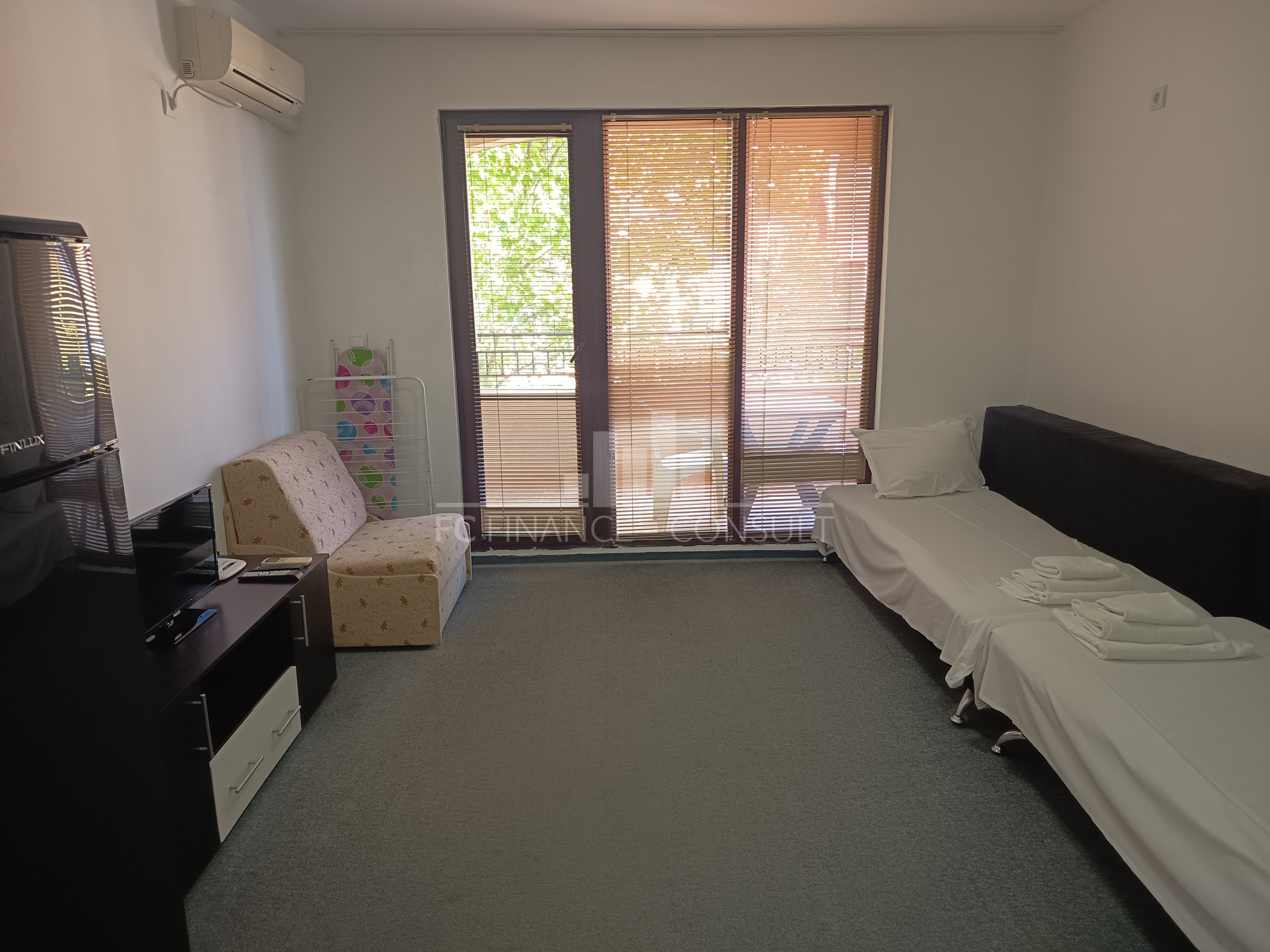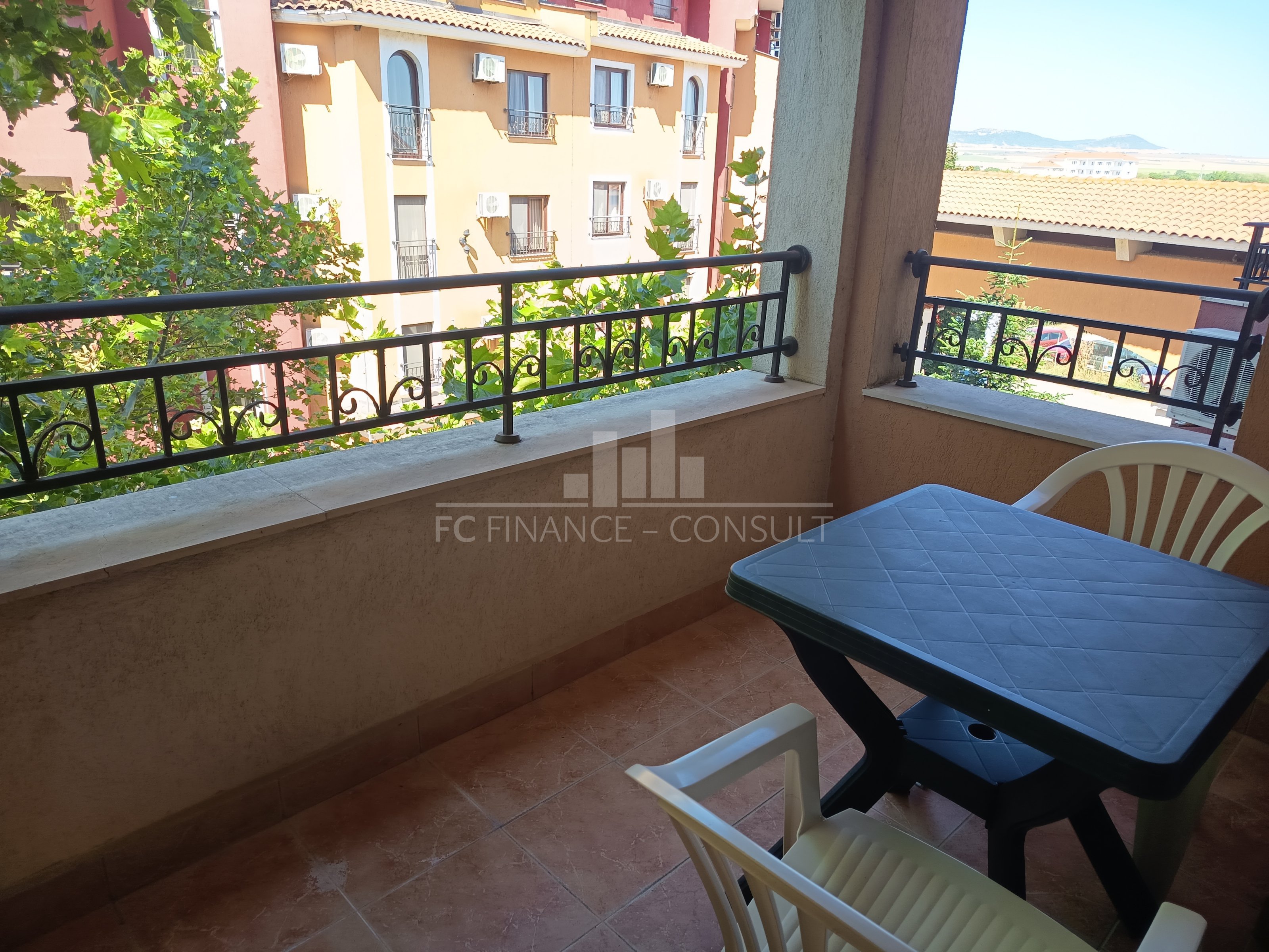 Тип на имота: обзаведено студио в много добро състояние с изглед към зелени площи • Разпределение: коридор, дневна с кухненски кът, баня с тоалетна, балкон • Квадратура: 48 кв.м с общите части • Локация и удобства: комплексът е разположен на брега на морето, на тихо място, точно на плажа • Разстояние до плажа: 10 метра • Възможност за разсрочено плащане до 3 години: да • Първоначална вноска: мин 50% • Гледка: градина • Възможност за паркиране: в комплекса, на улицата • Разрешение за ползване: да • Годишна такса поддръжка: 12 евро/м2/година • Комплексът предлага следните удобства: рецепция, басейни, включително детски басейн, ресторанти с българска / европейска кухня, магазин за хранителни стоки и магазин за плажни аксесоари, модерен фитнес център на закрито, сауни, СПА център, детски клуб, стаи за масаж, медицински център / медицинско обслужване в сезона, детски и спортни площадки, безплатен неохраняем и безплатен охраняем паркинг, индивидуални екскурзии, коли под наем, мини футбол, билярд и тенис на маса.