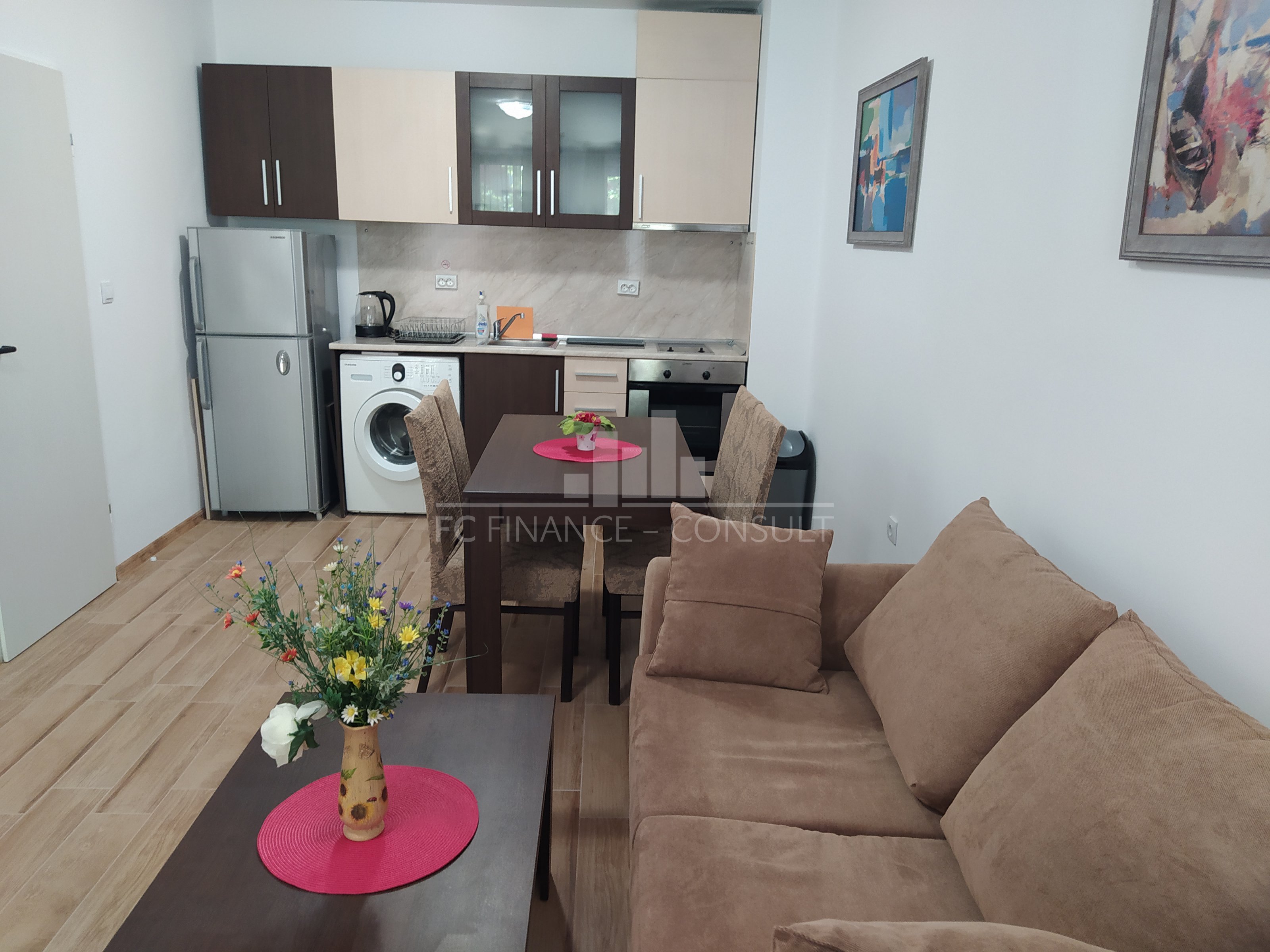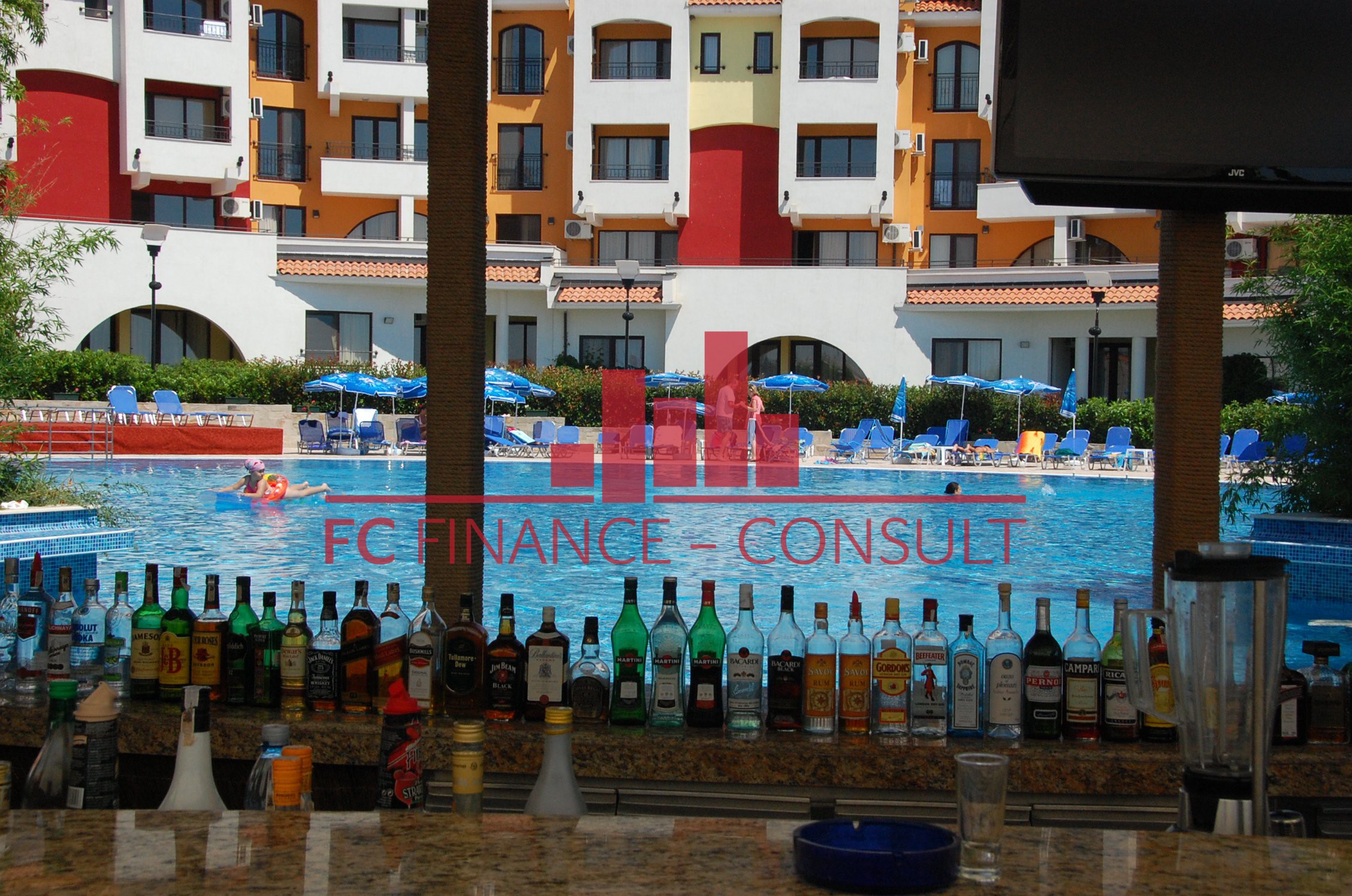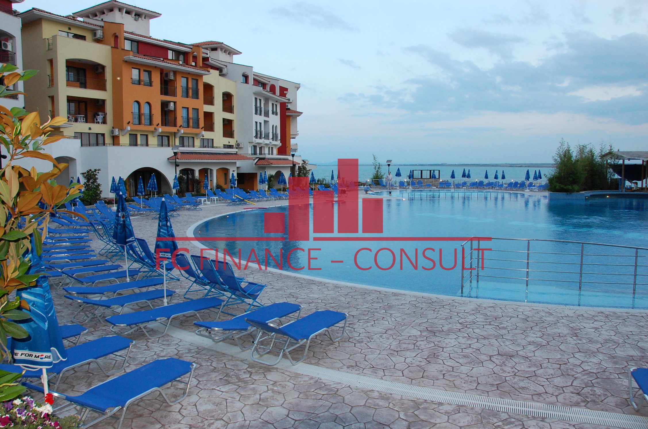 Тип на имота: обзаведен, след ремонт, едноспален в много добро състояние с изглед градина и улица • Разпределение: коридор, дневна с кухненски кът, спалня, баня с тоалетна, балкон • Квадратура: 64 кв.м с общите части • Локация и удобства: комплексът е разположен на брега на морето, на тихо място, точно на плажа • Разстояние до плажа: 10 метра • Възможност за разсрочено плащане до 5 години: да • Първоначална вноска: 30000 евро • Гледка: улица, градина • Възможност за паркиране: в комплекса, на улицата • Разрешение за ползване: да • Годишна такса поддръжка: 12 евро/м2/година • Комплексът предлага следните удобства: рецепция, басейни, включително детски басейн, ресторанти с българска / европейска кухня, магазин за хранителни стоки и магазин за плажни аксесоари, модерен фитнес център на закрито, сауни, СПА център, детски клуб, стаи за масаж, медицински център / медицинско обслужване в сезона, детски и спортни площадки, безплатен неохраняем и безплатен охраняем паркинг, индивидуални екскурзии, коли под наем, мини футбол, билярд и тенис на маса.
