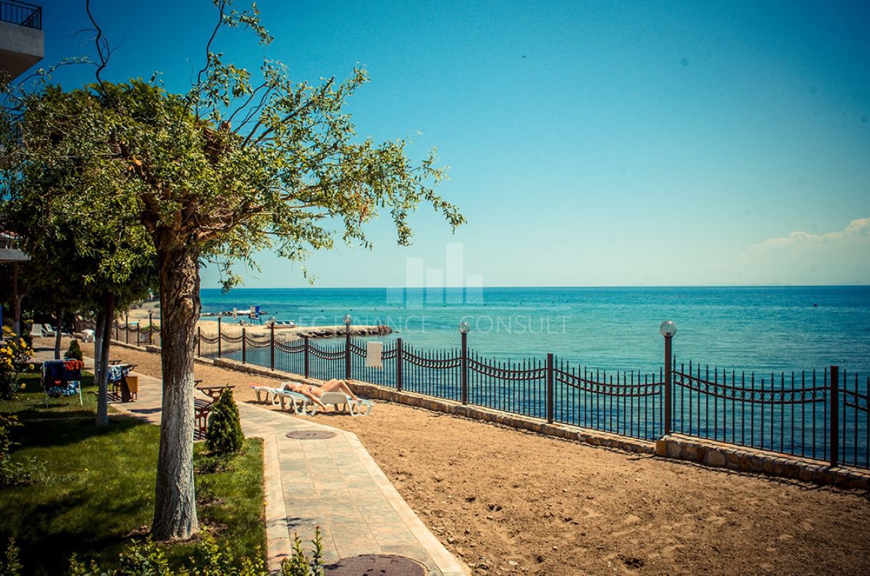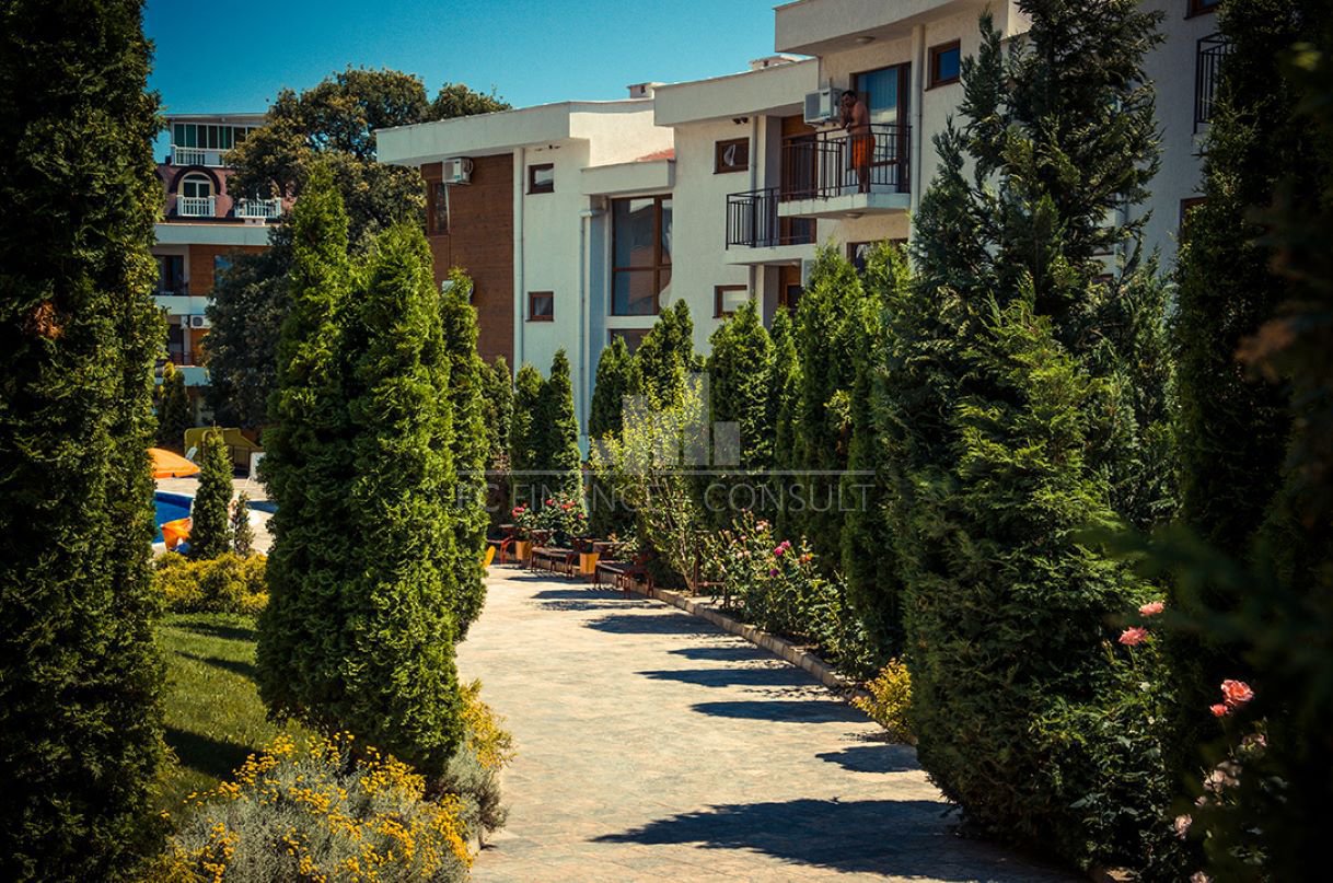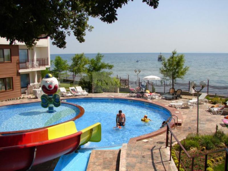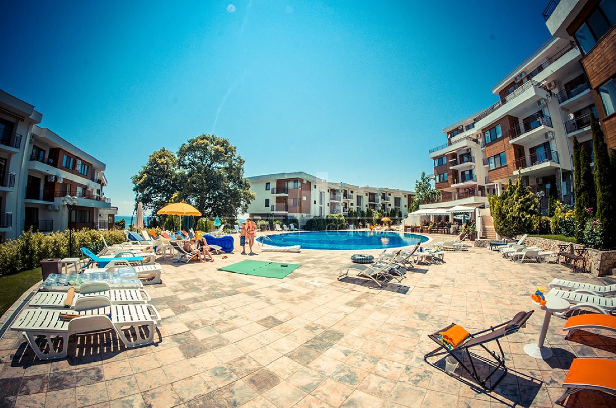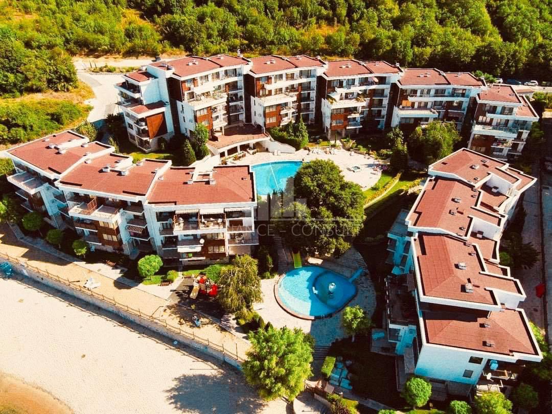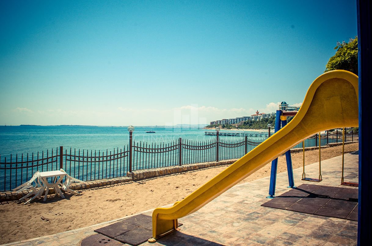 Тип на имота: 2 стаен • Квадратура: 73 кв.м с общите части • Локация и удобства: комплексът е разположен на брега на морето, в центъра на курорта • Разстояние до плажа: 10 метра • Възможност за разсрочено плащане до 7години: да • Първоначална вноска: 10% • Гледка: градина • Възможност за паркиране: в комплекса, на улицата • Разрешение за ползване: да • Годишна такса поддръжка: 14 евро/м2/година • Разпределение: коридор, дневна с кухненски кът, спалня, баня с тоалетна, балкон • Комплексът предлага следните удобства: рецепция, басейни, включително детски басейн, ресторанти с българска / европейска кухня, магазин за хранителни стоки и магазин за плажни аксесоари, фитнес уреди на открито или закрито, сауна, СПА център, детски клуб, стая за масаж, медицински център / медицинско обслужване в сезона, детски и спортни площадки, неохраняем и охраняем паркинг, обменно бюро, индивидуални екскурзии, коли под наем, тенис корт в съседство.