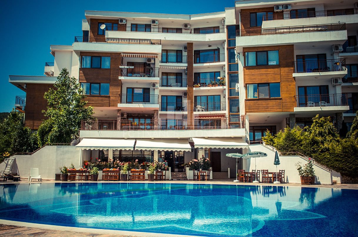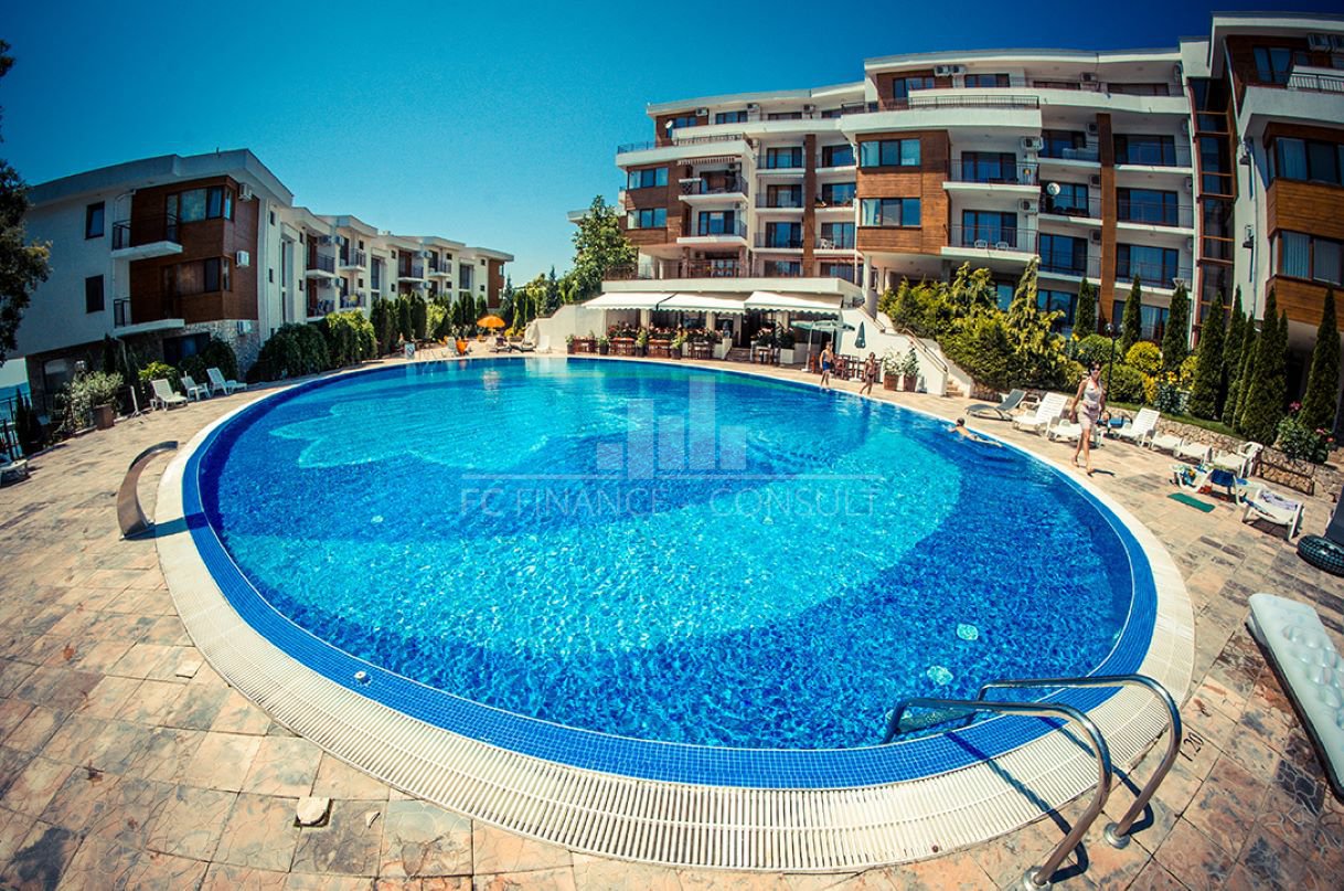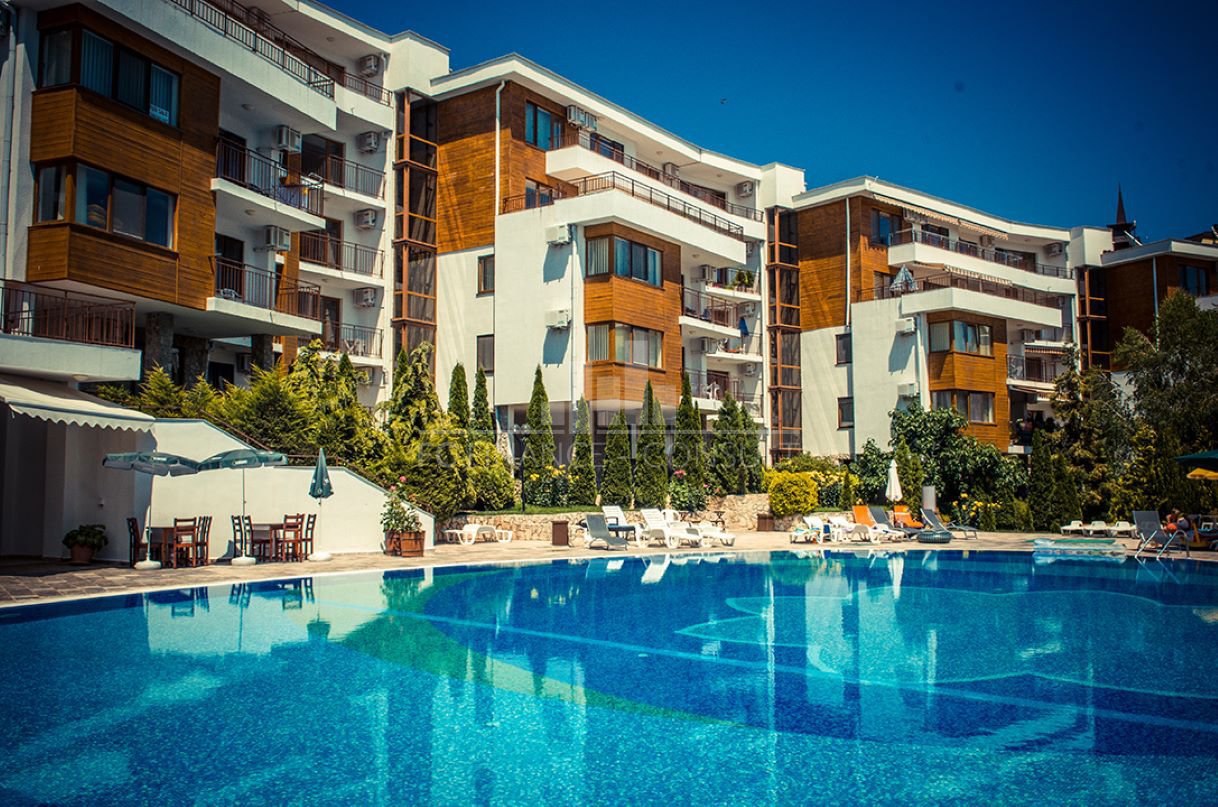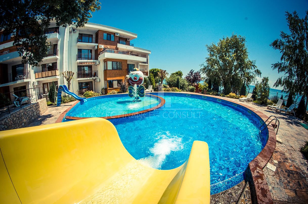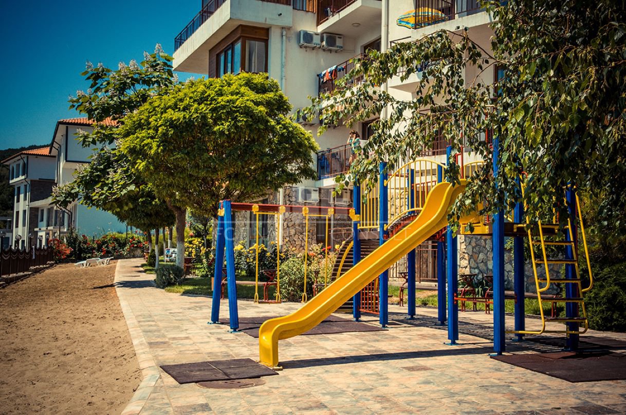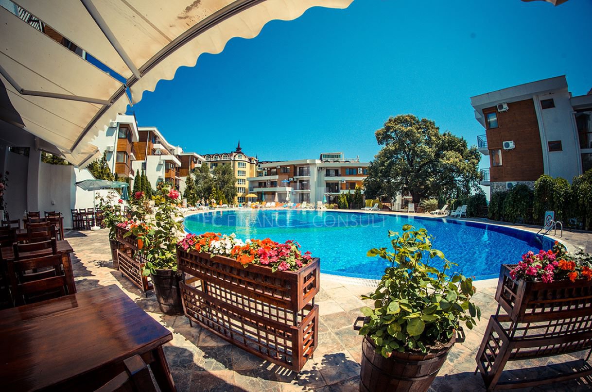 Тип на имота: 2 стаен • Квадратура: 73 кв.м с общите части • Локация и удобства: комплексът е разположен на брега на морето, в центъра на курорта • Разстояние до плажа: 10 метра • Възможност за разсрочено плащане до 7години: да • Първоначална вноска: 10% • Гледка: градина • Възможност за паркиране: в комплекса, на улицата • Разрешение за ползване: да • Годишна такса поддръжка: 14 евро/м2/година • Разпределение: коридор, дневна с кухненски кът, спалня, баня с тоалетна, балкон • Комплексът предлага следните удобства: рецепция, басейни, включително детски басейн, ресторанти с българска / европейска кухня, магазин за хранителни стоки и магазин за плажни аксесоари, фитнес уреди на открито или закрито, сауна, СПА център, детски клуб, стая за масаж, медицински център / медицинско обслужване в сезона, детски и спортни площадки, неохраняем и охраняем паркинг, обменно бюро, индивидуални екскурзии, коли под наем, тенис корт в съседство.