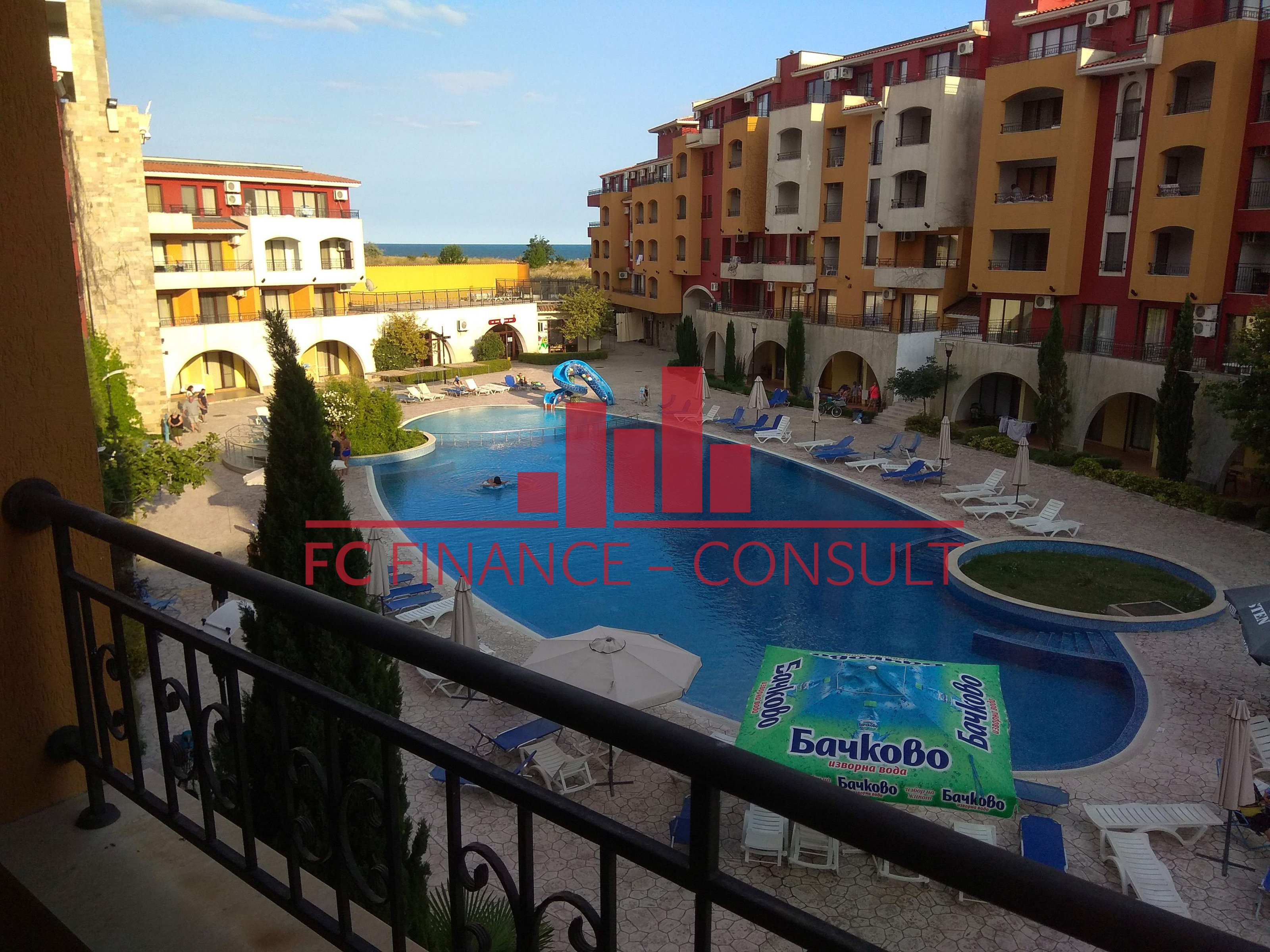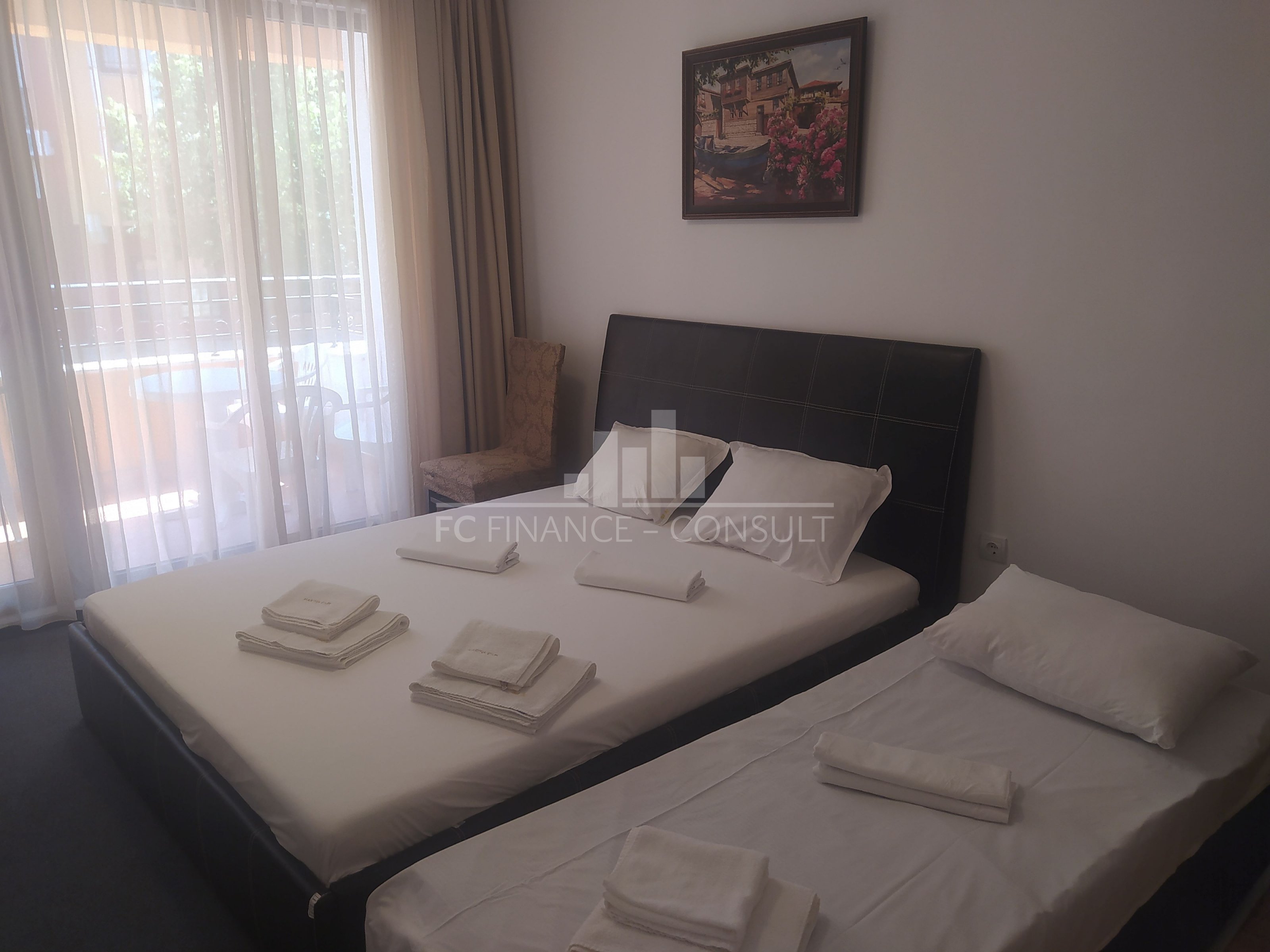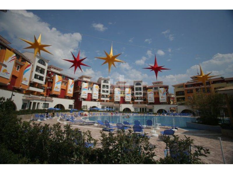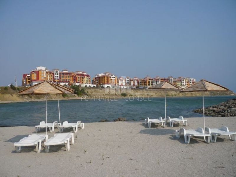 Тип на имота: обзаведено, голямо студио в много добро състояние с изглед към градината • Разпределение: коридор, дневна с кухненски кът, баня с тоалетна, балкон • Квадратура: 45 кв.м заедно с общите части • Локация и удобства: комплексът е разположен на брега на морето, на тихо място, точно на плажа • Разстояние до плажа: 10 метра • Възможност за разсрочено плащане до 5 години: да • Първоначална вноска: 20000 евро • Гледка: градина, паркинг • Възможност за паркиране: в комплекса, на улицата • Разрешение за ползване: да • Годишна такса поддръжка: 12 евро/м2/година • Комплексът предлага следните удобства: рецепция, басейни, включително детски басейн, ресторанти с българска / европейска кухня, магазин за хранителни стоки и магазин за плажни аксесоари, модерен фитнес център на закрито, сауни, СПА център, детски клуб, стаи за масаж, медицински център / медицинско обслужване в сезона, детски и спортни площадки, безплатен неохраняем и безплатен охраняем паркинг, индивидуални екскурзии, коли под наем, мини футбол, билярд и тенис на маса.