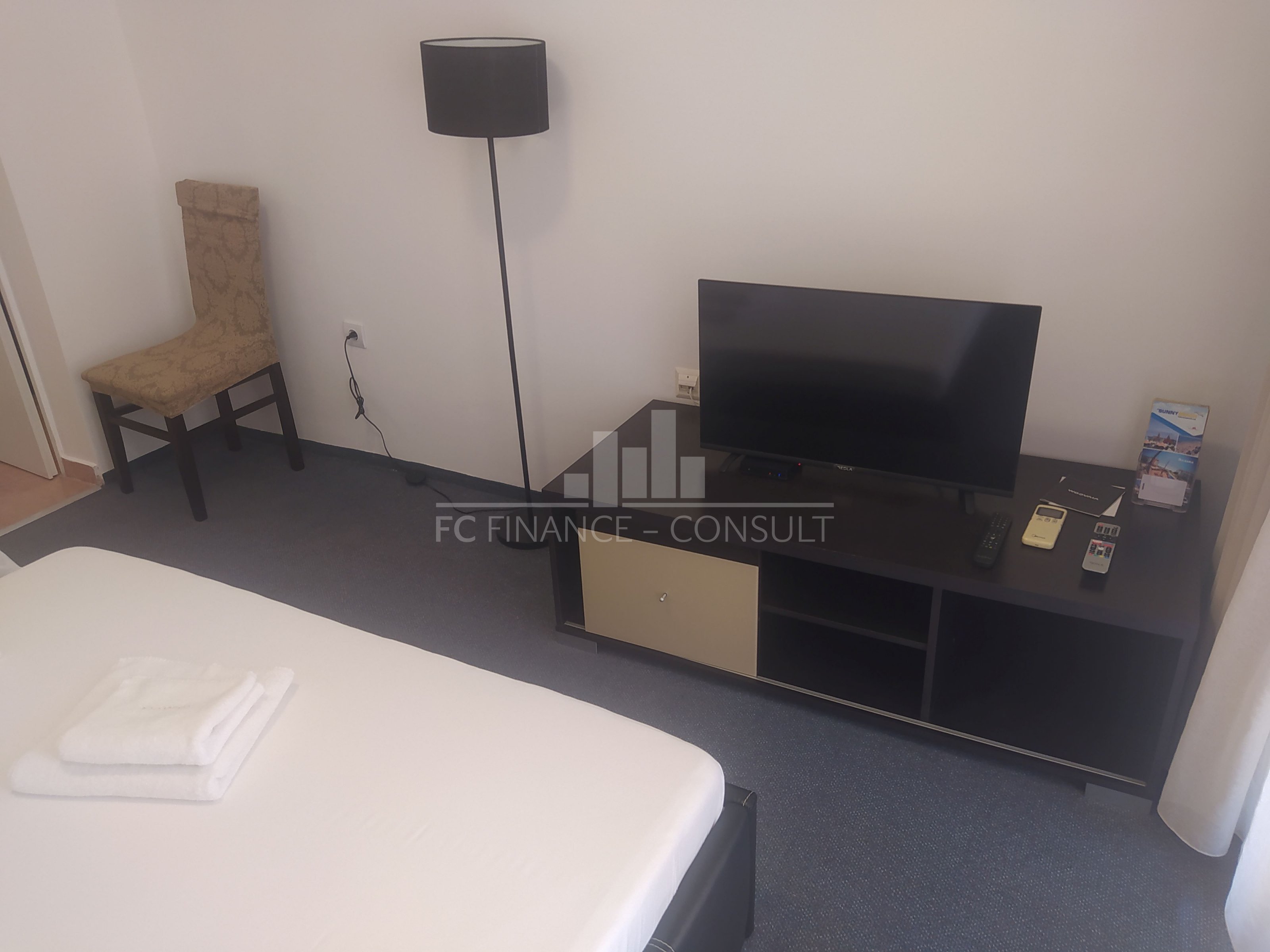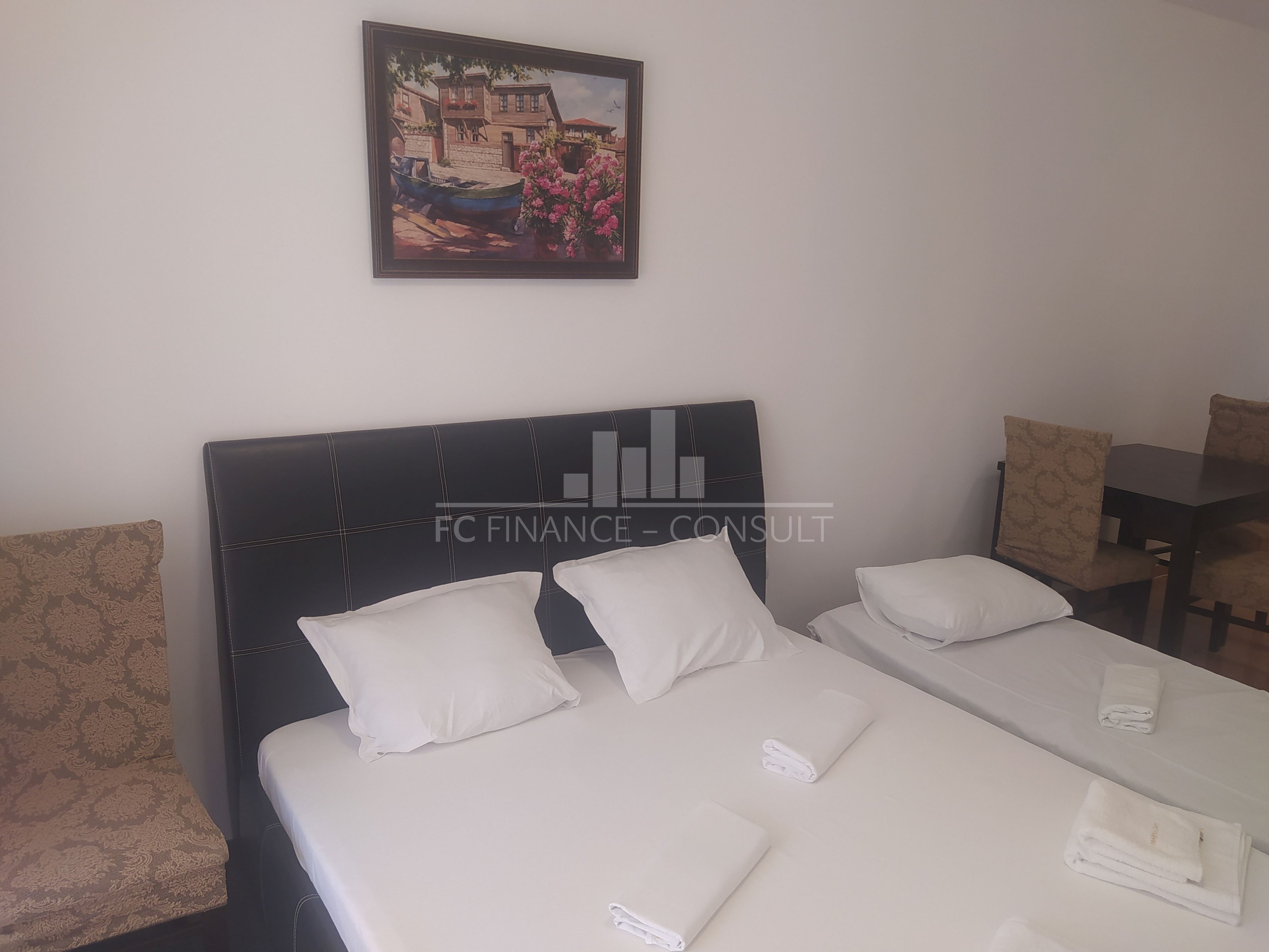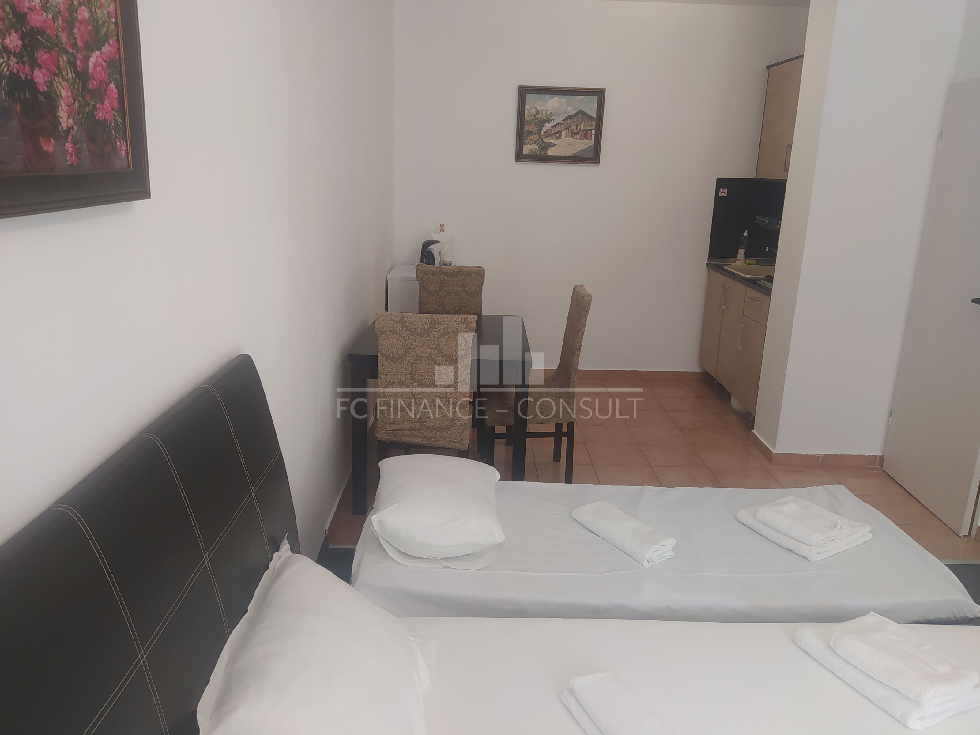 Тип на имота: обзаведено, голямо студио в много добро състояние с изглед към градината • Разпределение: коридор, дневна с кухненски кът, баня с тоалетна, балкон • Квадратура: 45 кв.м заедно с общите части • Локация и удобства: комплексът е разположен на брега на морето, на тихо място, точно на плажа • Разстояние до плажа: 10 метра • Възможност за разсрочено плащане до 5 години: да • Първоначална вноска: 20000 евро • Гледка: градина, паркинг • Възможност за паркиране: в комплекса, на улицата • Разрешение за ползване: да • Годишна такса поддръжка: 12 евро/м2/година • Комплексът предлага следните удобства: рецепция, басейни, включително детски басейн, ресторанти с българска / европейска кухня, магазин за хранителни стоки и магазин за плажни аксесоари, модерен фитнес център на закрито, сауни, СПА център, детски клуб, стаи за масаж, медицински център / медицинско обслужване в сезона, детски и спортни площадки, безплатен неохраняем и безплатен охраняем паркинг, индивидуални екскурзии, коли под наем, мини футбол, билярд и тенис на маса.