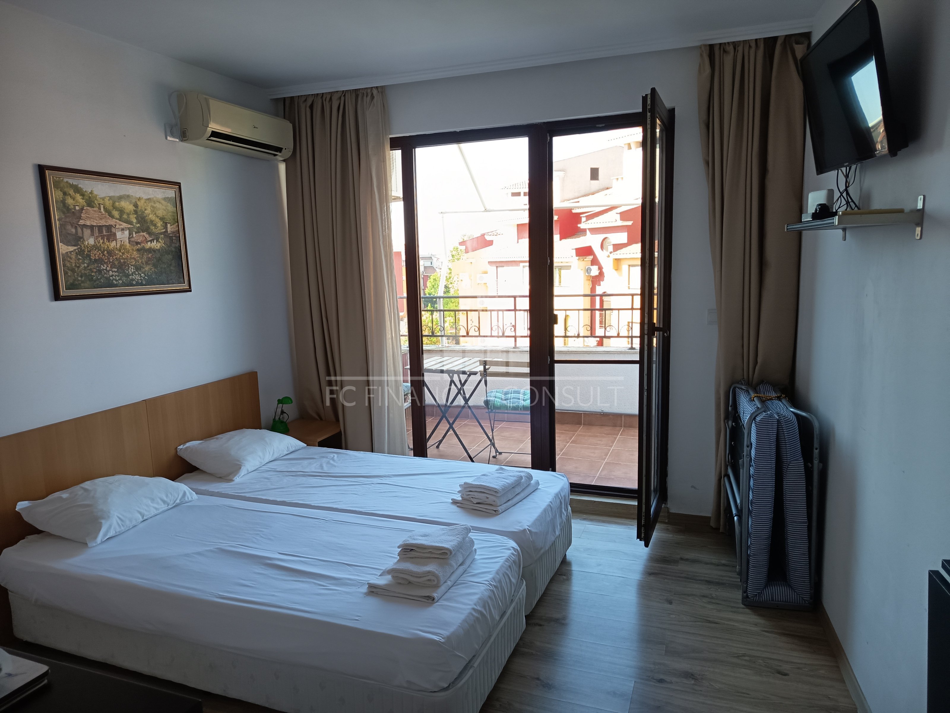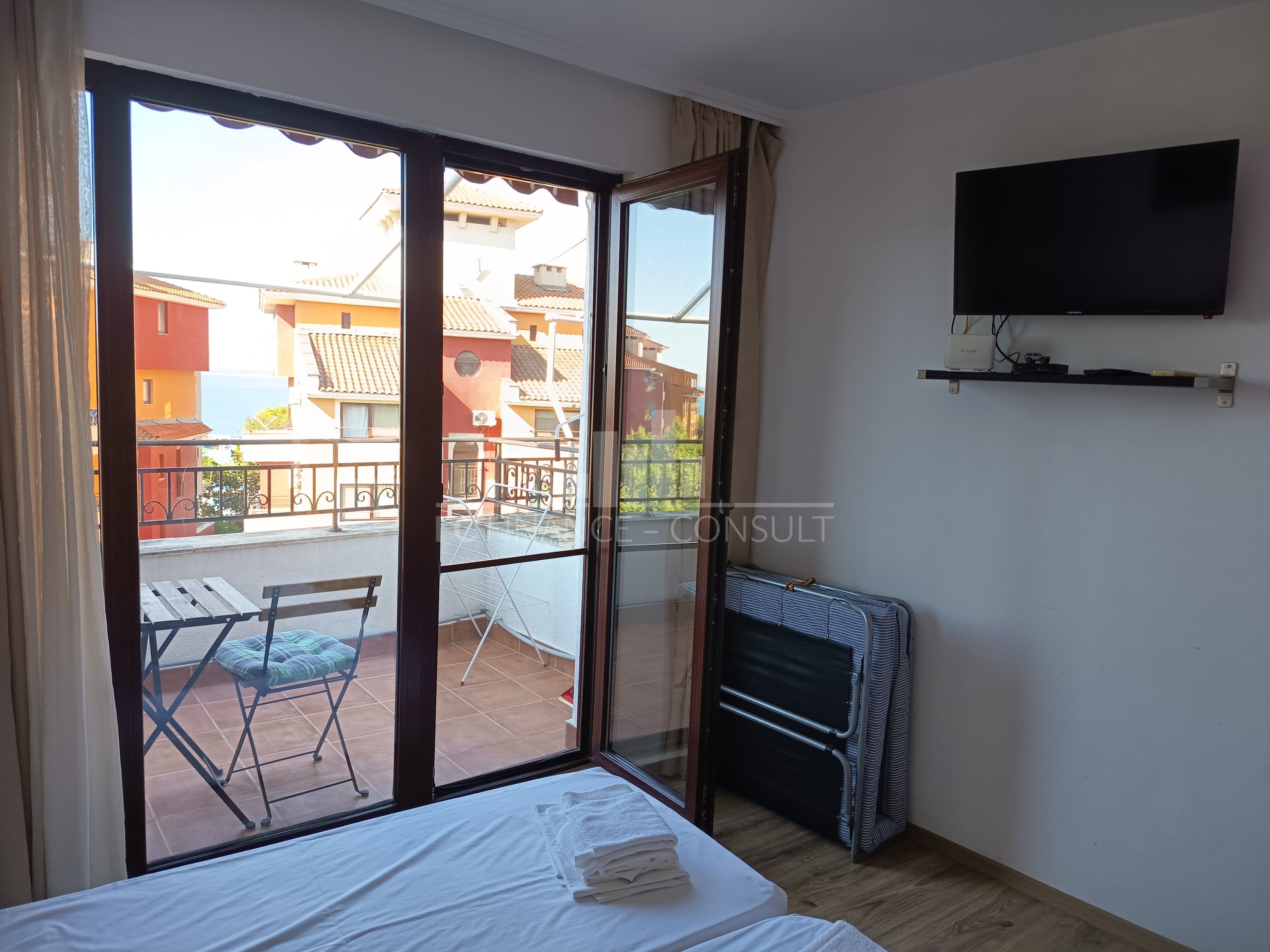 Студио с кухненски бокс и гледка към морето, с площ 34 кв. м, разположено в частен, напълно оборудван ваканционен комплекс на 4-ти етаж в пететажна сграда. Все повече хора работят дистанционно и търсят място, където могат да съчетаят работа, качество на живот и разумни разходи. България - по-специално Слънчев бряг и Ахелой - предлагат идеални условия не само за дигитални номади, но и за хора, които желаят спокойно място край морето. Морето и плажът- буквално на няколко крачки от работното ви място. В Ахелой апартаментите се намират на първа линия, в модерен комплекс, разположен на около 15 минути с кола от летище Бургас и центъра. Комплексът е разположен до един от най-красивите пясъчни плажове в района, към който принадлежи и малко пристанище с рибарски лодки. На територията на комплекса има: 4 ресторанта; кафенета и барове; 2 басейна и воден бар към басейна; спортен център, кортове за скуош; фитнес център, уелнес и СПА център, масажи; кабинети на общопрактикуващ лекар и стоматолог; супермаркет и по-малки магазини; Сутрешното плуване в морето, онлайн работата през деня и вечерните разходки по крайбрежието тук се превръщат в естествена част от ежедневието. Слънчев бряг предлага по-жива атмосфера, с ресторанти, кафенета и услуги, достъпни през цялата година, докато Ахелой може да ви зареди със спокойствие. Ниски разходи - идеално за дистанционна работа и почивка: Дългосрочен наем от 220 € на месец; Условия за плащане: 3 месеца авансово + 1 възвръщаем депозит; Интернет и телевизия (около 150 канала) срещу допълнително заплащане; Водата и електроенергията се заплащат според реалното потребление; Безплатен и платен паркинг; Възможност за дългосрочен наем на наш автомобил; Апартаментите са напълно обзаведени, с кухня и всички необходими домакински уреди. В момента се предлагат следните типове апартаменти: студиа; апартаменти с една спалня и кухненски бокс; апартаменти с две спални и кухненски бокс; Апартаментите са подходящи за самостоятелни лица, двойки, семейства, колеги, работещи дистанционно, както и за хора с инвалидни или пенсионни доходи. Просто за всички, които мечтаят за по-добър живот - живот край морето. Слънчев бряг, Несебър, Бургас, Свети Влас, Равда, Ахелой - отлична достъпност. Отлична транспортна достъпност: летище, градски транспорт, пътна мрежа. Летище Бургас - само на няколко минути от Ахелой. Самолетни връзки и извън активния сезон; летище Варна на около 80 км. Всичко е в близост до град Бургас. Отлична инфраструктура, сигурност и постоянна многоезична поддръжка. Училища, детски градини, здравни заведения, поща, множество супермаркети, ресторанти и пълна гама от услуги - накратко, всичко е буквално на една ръка разстояние. Апартаментите са наша собственост, без посредници на недвижими имоти - не заплащате никакви комисиони на посредници. Поддръжка на място е осигурена целогодишно. Много европейци вече живеят тук дългосрочно - работят онлайн или са открили нов ритъм на живот.