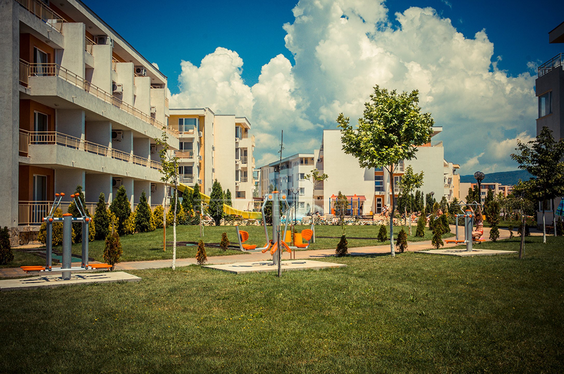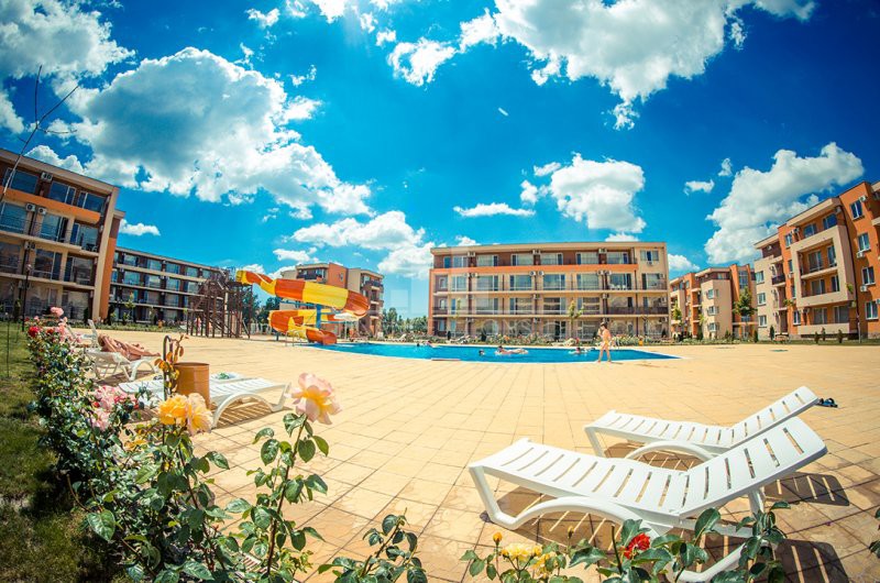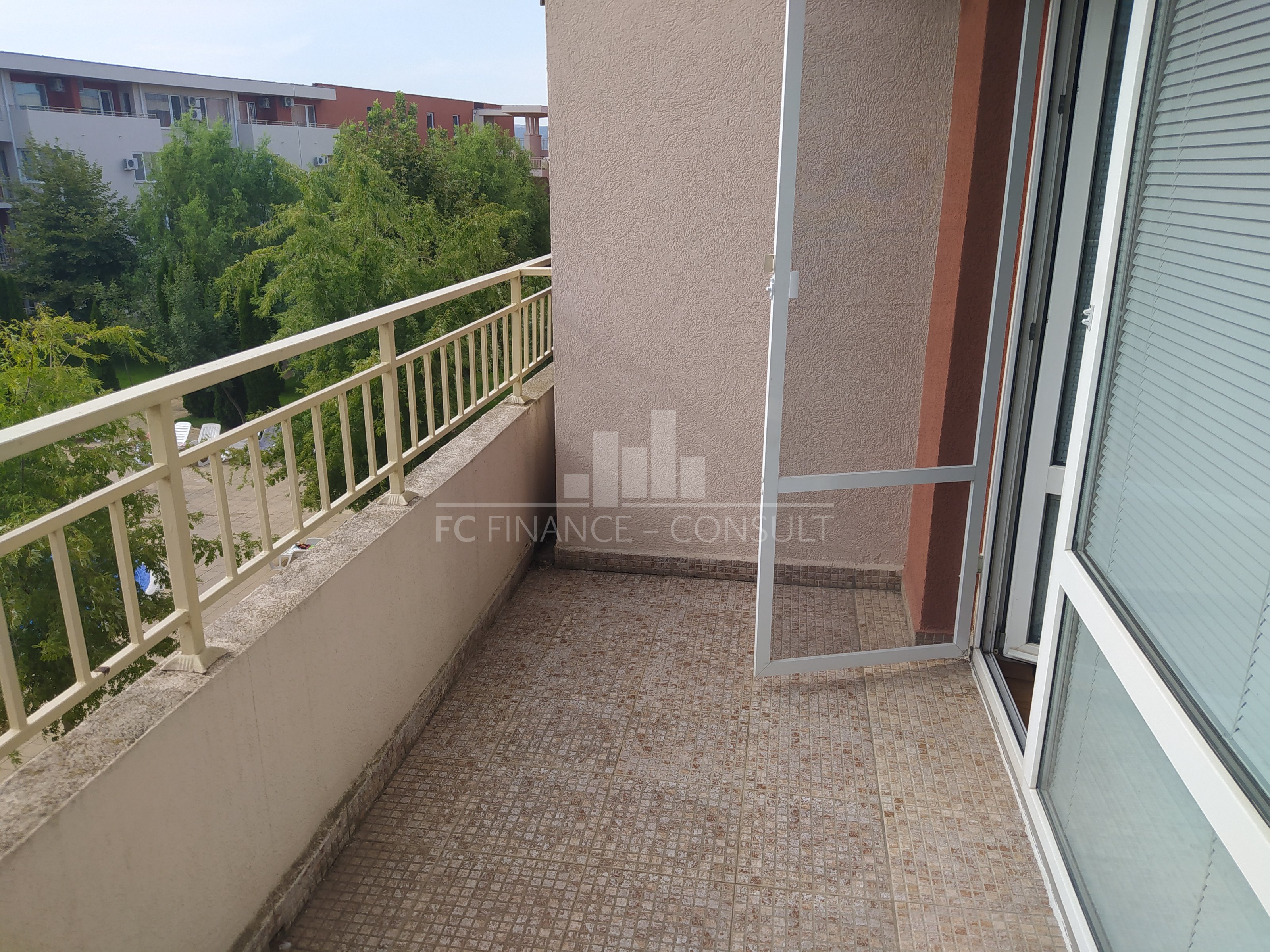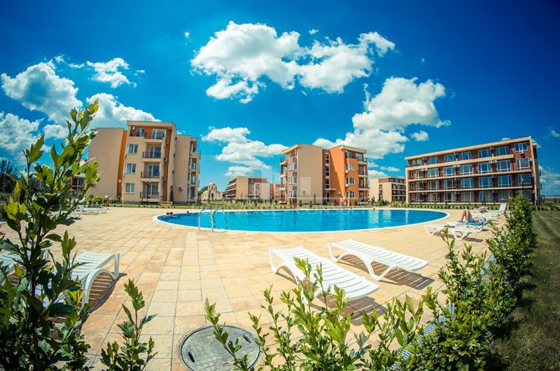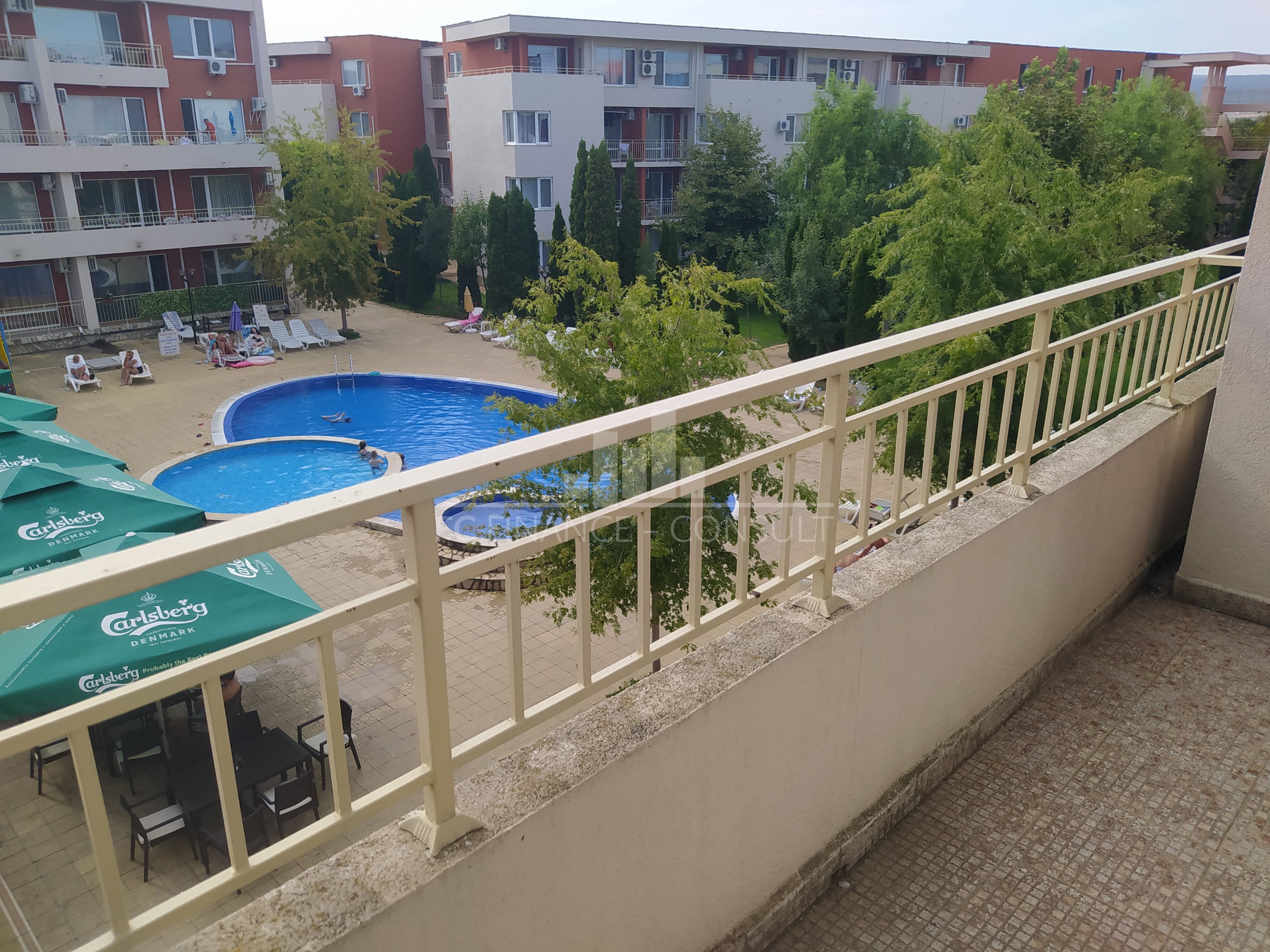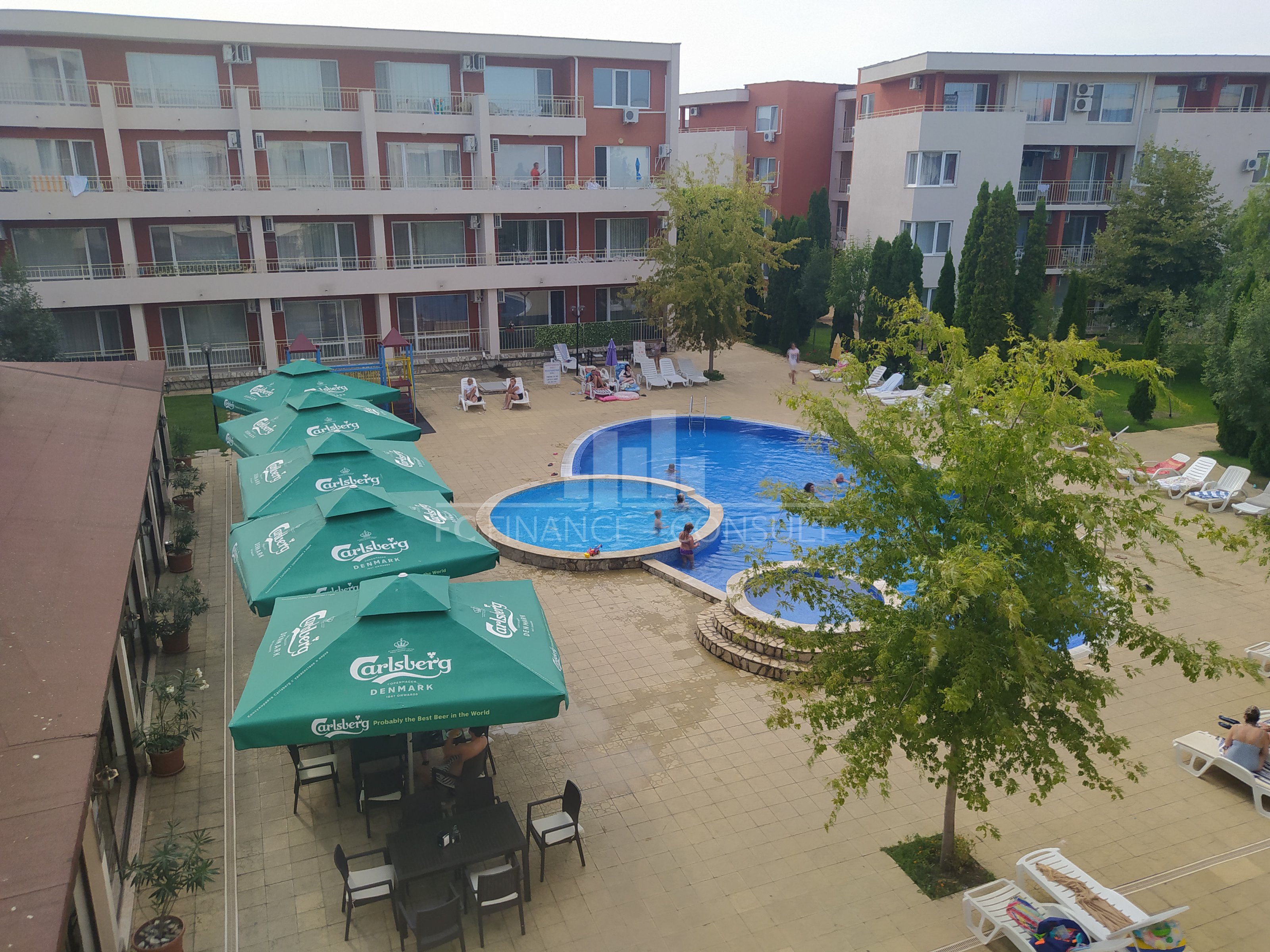 Обзаведен едностаен студио апартамент с обща площ 40м2 и изглед басейн в Слънчев бряг. • Тип на имота: студио • Разпределение: коридор, дневна с кухненски кът, баня с тоалетна, балкон • Квадратура: 40 кв.м • Локация и удобства: комплексът е разположен в близост до центъра на курорта на тихо място • Разстояние до плажа: 600 метра • Възможност за разсрочено плащане до 7години: не • Първоначална вноска: 100% • Гледка: градина, басейн • Възможност за паркиране: безплатно пред комплекса, на улицата • Разрешение за ползване: да • Годишна такса поддръжка: 13,50 евро/м2/година • Комплексът предлага следните удобства: рецепция, басейни, включително детски басейн, ресторанти с българска / европейска кухня, магазин за хранителни стоки и магазин за плажни аксесоари, фитнес уреди на открито или закрито, сауна, СПА център, детски клуб, стая за масаж, медицински център / медицинско обслужване в сезона, детски и спортни площадки, обменно бюро, индивидуални екскурзии, коли под наем, тенис корт, мини футбол, мини голф, билярд и тенис на маса, електрони игри за деца.